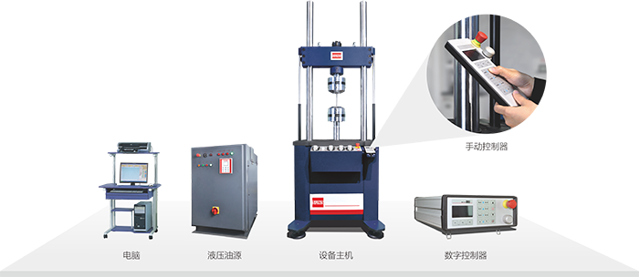 电液伺服动态疲劳试验机可根据用户的具体试验要求来进行配置,选择主机载荷框架(集成安装了作动缸和伺服阀)、液压油源、DOLI控制系统(DOLI控制系统系统包含三部分:在计算机上的DOLI系统软件,数字控制器和手动控制面板)、夹具和附件。