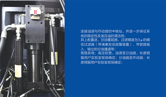 ① 采用静音型、变量泵式液压油源,可手动和远程开启液压动力源,并且提供远程液压油源控制终端(中文界面);油泵处于高压和满负荷流量状态时,噪声声压级不超过55dB(1米范围内),带一套至少6米长油管;